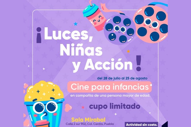 PUEBLA, MÉXICO.- Este verano, la diversión también tiene corazón y conciencia. Del 28 de julio al 25 de agosto, la Sala Mirabal del Centro Histórico de Puebla abrirá sus puertas para recibir a niñas, niños y sus familias con el ciclo de cine “¡Luces, niñas y acción!”, una propuesta del Gobierno del Estado a través de la Secretaría de las Mujeres.